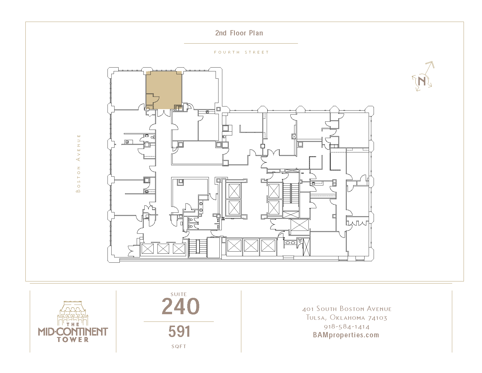 Mid-Continent Tower — 2nd Fl, Ste 240401 S Boston Ave. Tulsa, OK 74103Rate includes utilities, building services and property expenses. SIZE 591 SF TERM Negotiable RATE Upon Request SPACE USE Office CONDITION - AVAILABLE Now Download Floor Plan