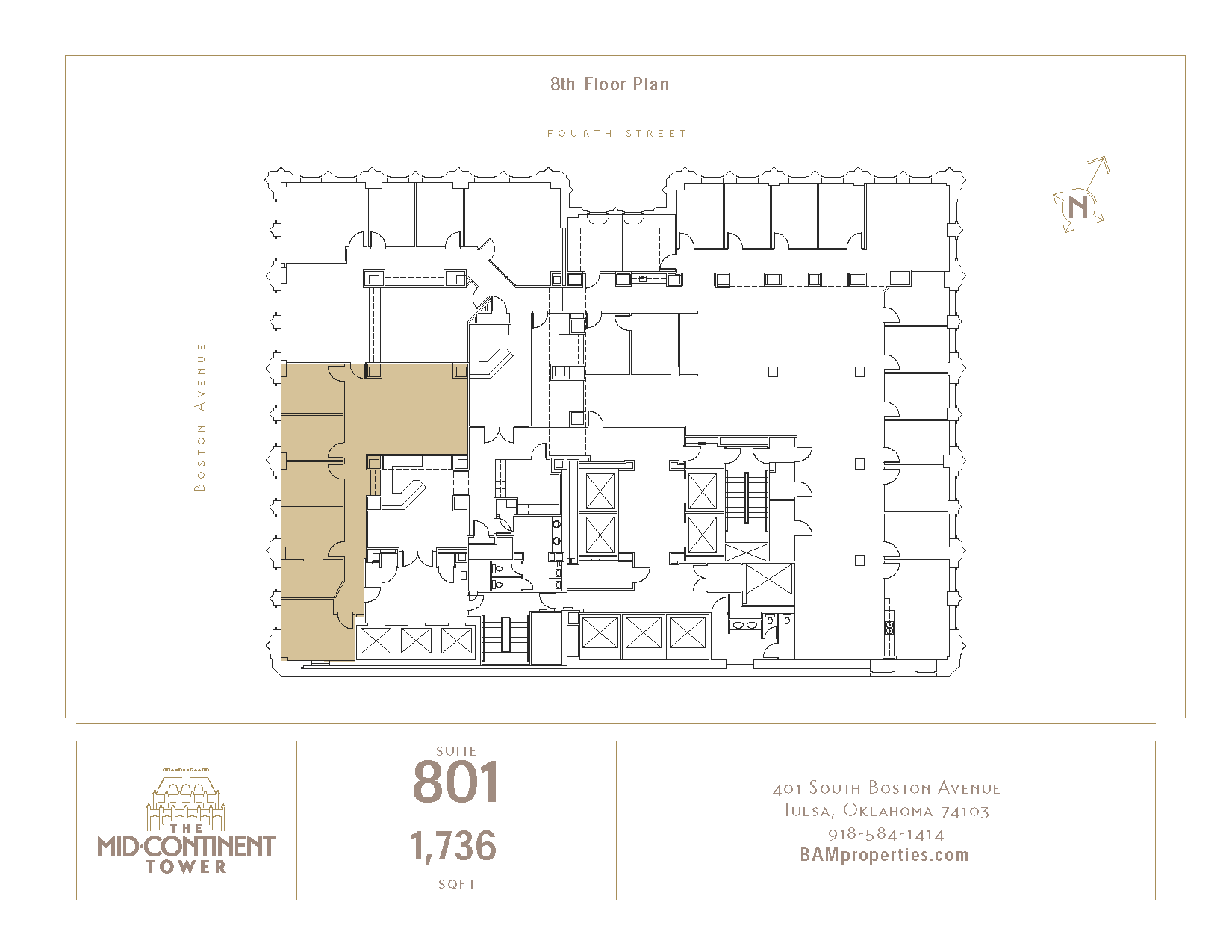 Mid-Continent Tower — 8th Fl, Ste 801401 S Boston Ave. Tulsa, OK 74103Rate includes utilities, building services and property expenses. SIZE 1,736 SF TERM Negotiable RATE Upon Request SPACE USE Office CONDITION - AVAILABLE Now Download Floor Plan